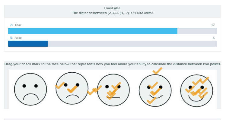 Another way in which Pear Deck has changed my classroom is by allowing multiple opportunities for formative assessment. Pear Deck currently offers the following interactive options: multiple choice, true/false, entering a text, entering a number, writing on slides, and draggable slides. By being creative with questioning, I have been able to ask students various questions that give me insight into how they are doing with the current material. I can then use this feedback to help determine where I might need to provide more instruction to the whole class or where specific students might need extra support. Below are some examples of how I have used Pear Deck to aid in formative assessment.