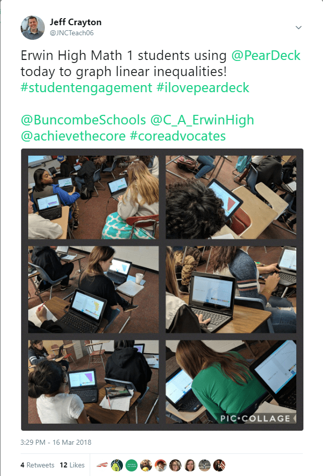 I was hesitant at first to implement a piece of technology into my classroom with no training. However, I found that this platform was intuitive and easy to use for both myself and my students. I found myself sharing the lessons I created with other members of my department. By using Pear Deck, my students are engaged in the learning and receive immediate feedback. In this next school year, I plan on using Pear Deck more in Math 1 and implementing it in my other classrooms. Tweet @achievethecore, @JNCTeach06, and @peardeck to share how you will implement a lesson this year. Who knows, you may even get a shoutout from Pear Deck on Twitter!