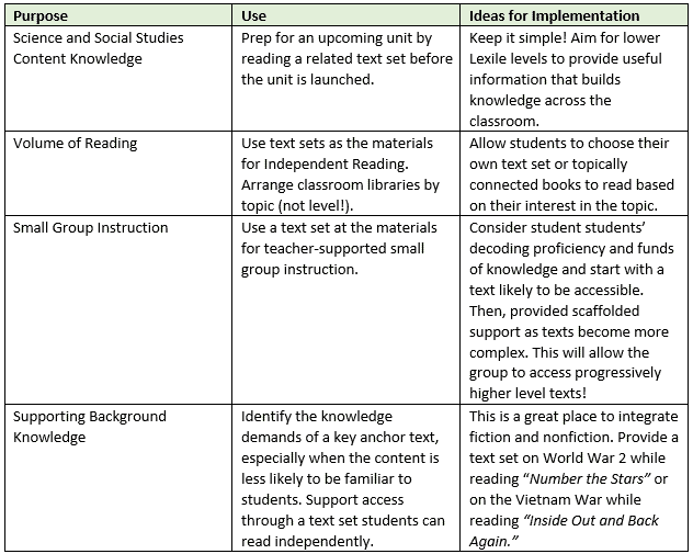 Once you begin using text sets in your classroom, you’ll undoubtedly find a myriad of uses that range from a light teacher lift to one that requires in-depth planning.  Note that in using even the lightest approach, you’ll be supporting your students as they build the background knowledge and academic vocabulary necessary for them to engage meaningfully with texts in the future.  And, more immediate evidence of their success might just be in their dinner conversation, answering the question “So, what did you learn about today?”