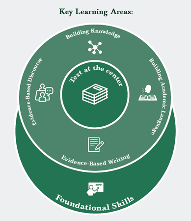 Together, these areas represent essential ELA/literacy content and the interdependent nature of literacy development: complex text at the center of instruction is crucial to the literacy development of student; foundational skills are the early basis of all literacy work; and building knowledge, building academic language, evidence-based writing, and evidence-based discourse operate together in various ways to engage students in deep understanding and analysis of texts.