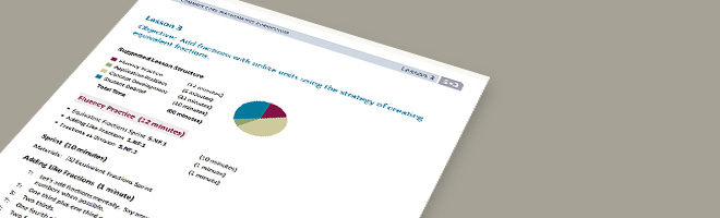 - Uses concrete and pictorial models, particularly the rectangular fraction model, to make the mathematics of the lesson explicit