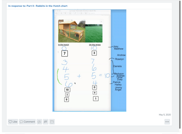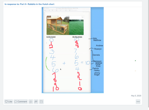 Since I knew students were familiar with Seesaw, I decided to post the video there and include a screenshot of our chart at the end of the video. I encouraged students to continue their work by adding on to the chart or drawing ways they could find the rabbits.