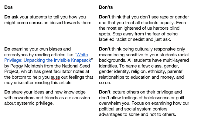 Some dos and don’ts for building culturally responsive classrooms: