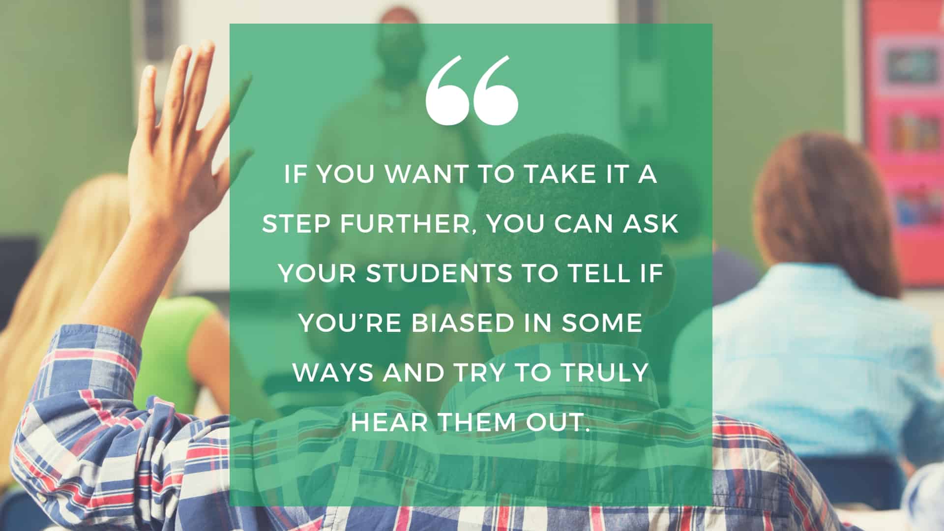 Probably the most important step, is to step back and carefully examine your own biases and stereotypes. If you want to take it a step further, you can ask your students to tell if you’re biased in some ways and try to truly hear them out. Students can help you identify your implicit bias, which you aren’t even aware that you hold.