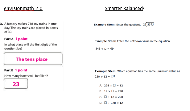 Let’s consider a system where the alignment of a district’s curriculum materials to the standards is deemed “close enough,” the alignment of the district’s interim/benchmark program to the standards is deemed “close enough,” and the alignment of that state’s summative assessment to the standards is deemed “close enough.” But none of these components is perfectly aligned and each has slightly different alignment issues (for example, the curricular materials have one alignment issue and the state summative assessment, another). What you get is information about students that is very difficult to interpret without understanding the nature of those alignment issues with respect to the intended outcomes, that is, the standards. The example below shows how differently standard 5.NBT.B.61 is measured in the enVisionmath 2.0 textbook Topic Assessment versus the Smarter Balanced summative assessment.