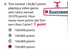 This problem is aligned to a procedural skill and fluency standard (4.NBT.B.4–Fluently add and subtract multi-digit whole numbers using the standard algorithm) but, because it is embedded in an application, we get unclear information about any potential sources of difficulty for a student. Additionally, multiple choice item formats are not well suited for measuring fluency. In this case, a student needs to only subtract the ones digits of the two numbers and can select the correct answer from that one computation.