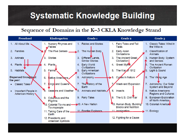 In the Listening and Learning Strand, the topics that students learn about were not randomly chosen, but rather are based upon the coherent knowledge sequences derived from research by content experts, educators, cognitive scientists and others. Known as The Core Knowledge Sequence (K–8), it is available for free download. The sequence of topics within and between grade levels is designed to build cumulatively upon the knowledge that students are taught in CKLA.