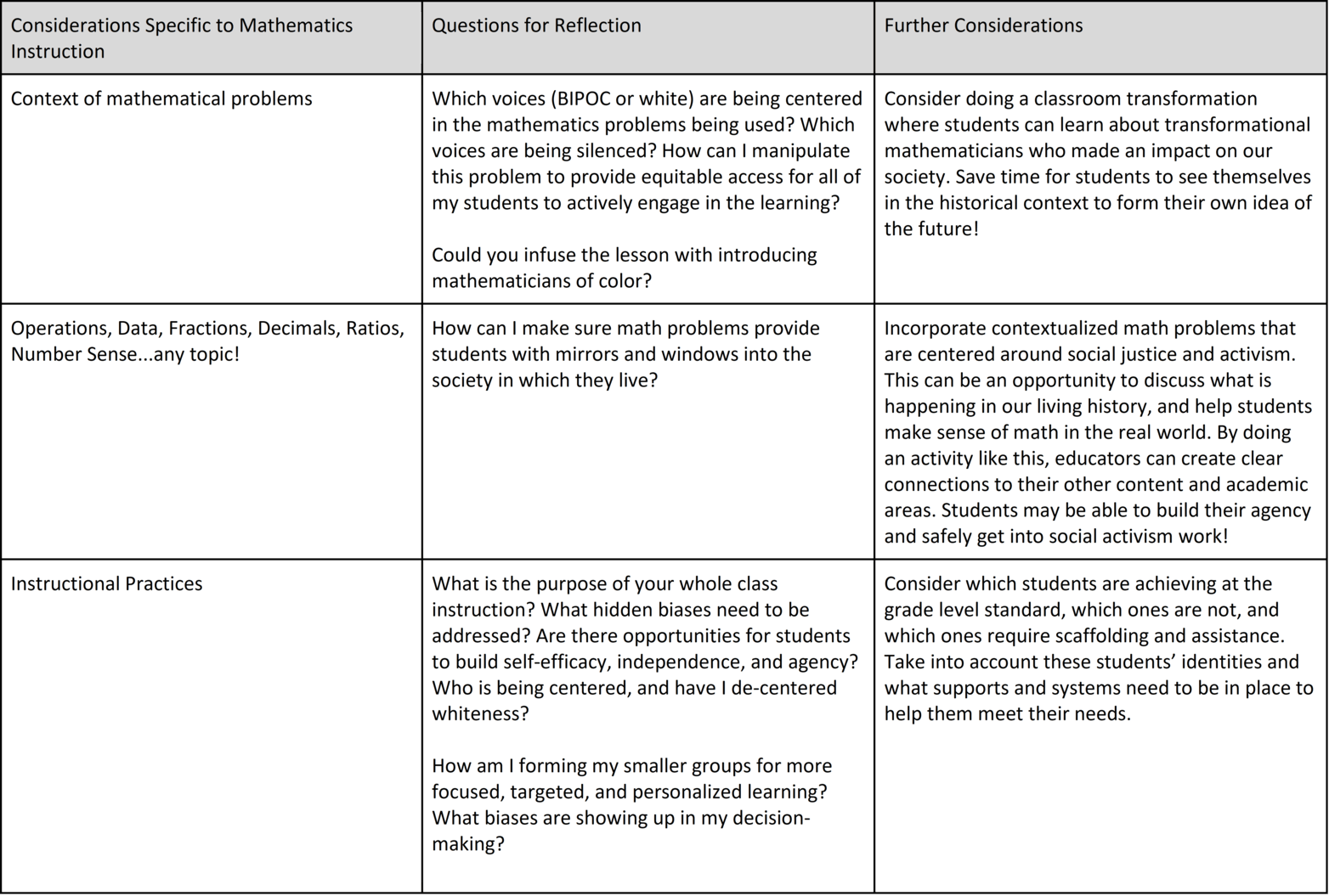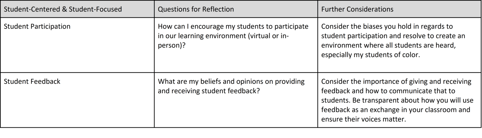 The table below considers a variety of learning environments and the questions you might use to reflect on whether those environments are equitable. While the table is not exhaustive, it can be a great starting point when thinking about how to repurpose our educational experiences for students. When planning and preparing for instruction, whether virtual or in person, consider the following to redefine your best practices. If you find that you are having difficulty with reflecting on the items and/or responding, I invite you to ask yourself why and engage in being open to thinking differently.