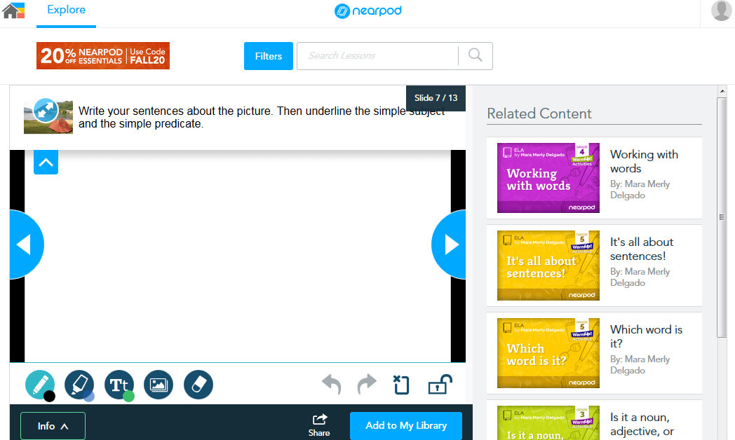 Tool 2: Nearpod. This is a slide deck tool with embedded questions that helps students process content.  It is as simple to use as building a PowerPoint slide (although it has many other applications) and then adding question elements throughout.  In the language arts classroom, try embedding a complex text that you want students to analyze in the slide. Insert the drawing tool right onto the slide.  Students can instantly show you where they are finding the main idea and supporting details using different colors, etc.  Once you see their responses, you can differentiate and send them different links to practice.  You can also embed multiple choice questions and short answer questions to check for understanding as well.  Responses can be shared with the whole class or tracked for understanding so everyone can be on the same page.