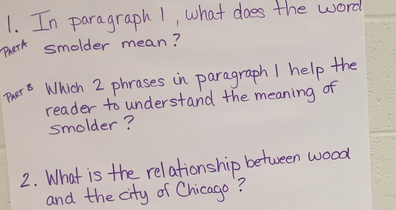 Now that you’ve primed them, get them to dream big: they are capable of writing their own questions.  Use this passage here and have them write question stems.  Have the group connect the stems in relationship to the Shifts and back to the claims that they are trying to prove. See these examples (below) from the last time I dared a group to enter the dream and to write some aligned questions to prove their claim that students could analyze the provided text. You can provide the questions in the mini-assessment for them to compare their questions after they have written their own first.