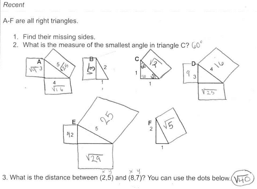 There is a great deal to notice here, from the sketching of squares to the correct calculation of distance. Clearly, this student knows a lot about the Pythagorean Theorem.