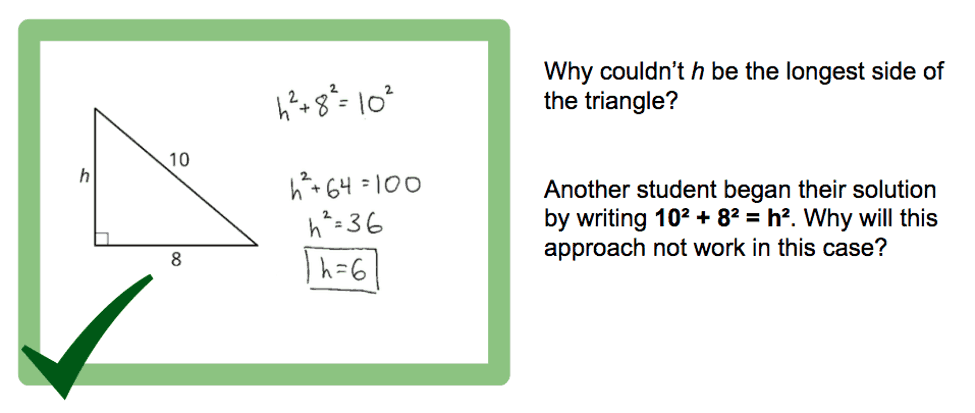 For my example, I chose to illustrate that the longest side of a triangle is always the “c” in a2+b2=c2. Along with the example, I wrote a pair of “self-explanation prompts,” to encourage students to think carefully about the work.