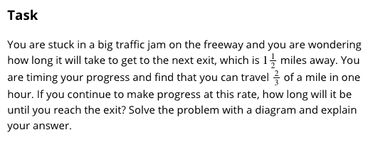 Write ratios three ways? Still too procedural. A nother bit of so-called math that NO ONE ever uses except in an elementary schopl. Draw a diagram for the first problem? Ok, but a waste of time for the student who writes (3/2 mi)/(2/3 mi/hr) = 9/4 hr = 2:15. And what happened to the units, which are the real key to getting this problem right? If you have miles, and miles per hour, it’s pretty obvious that you have to divide to convert miles to hours.