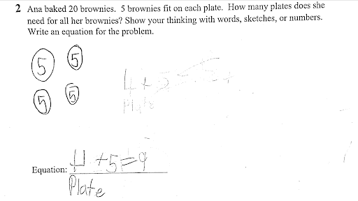 I also teach third grade. As I walked around the classroom while students worked, I stopped to observe Jose and question him about his response. Jose was working on the problem, “Ana baked 20 brownies. 5 brownies fit on each plate. How many plates does she need for all her brownies?” I could see how he represented the 20 brownies, with five on each plate. He didn’t have an answer for the problem, so I asked him how many plates were needed. He quickly responded, “Four  plates.” It was evident to me that Jose understands and represents the story. The next step is to work on representing it with an equation. In a traditional view of assessment, his answer might have been marked incorrect because he didn’t write an appropriate equation, overlooking what he does know and identifying a clear next step.