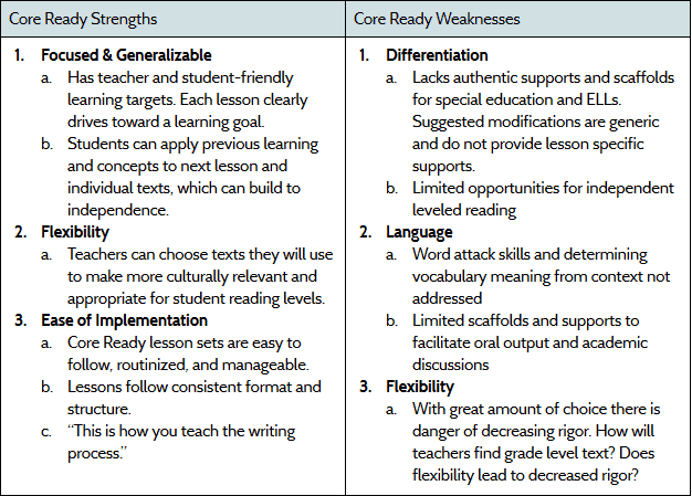 With Core Ready, principals were concerned that there were so many text options that cross-site work would be challenging. They also noticed issues of Standards-alignment, and a lack of student support features.