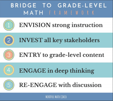 I’ve created a five-step framework to support teachers and coaches in bridging the gap to grade-level math. This framework addresses not only the academic and instructional strategies that are necessary to catch students up, but also their social-emotional needs related to confidence and motivation. I’m sharing it with you here: