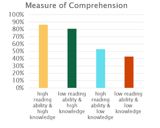 When the students were asked a series of comprehension questions, who do you think performed the best? You probably guessed correctly that those with a strong reading ability and a high knowledge of baseball performed the best, but a close second place went to those who knew a lot about baseball but were generally weak readers. These baseball-savvy, struggling readers outperformed their peers who were stronger readers. As you can see in the graph below, regardless of their reading ability, those with similar knowledge of baseball performed similarly on the comprehension test.