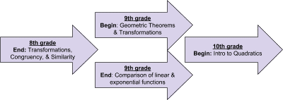 creating collaborative common assessments. Our first action step was to rearrange our curriculum modules so as to align with the last unit from eighth grade and end with a transitional unit into Integrated Math II, as shown by the diagram above. This alignment helps students see the connections between the transition of the math content from middle school to high school. For teachers, it helps them visually see the cohesiveness of the standards within the modules for all three grade levels. Our next action step focused on selecting essential standards necessary for Integrated Math 1 based on the vertical articulation of our standards between Integrated Math 1 through Integrated Math II. Finally, our third step centered on the development of each unit and how to give the best first instruction.