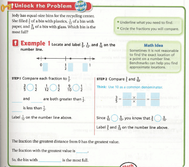 There are a lot of blanks, shaded squares, and circles that students are asked to fill in. The textbook developers were trying to lead students through a variety of strategies and models to help students compare the three fractions given. But at this point in 4th grade, students have had enough experience with fractions that they would likely come up with different ways of comparing fractions based on their reasoning and understanding of fractions. By giving just the problem (without all of the hints and suggested methods), students have the opportunity to make sense of the mathematics and the teacher has the opportunity to use different strategies students generate to facilitate a meaningful class discussion that’s based on mathematical reasoning.