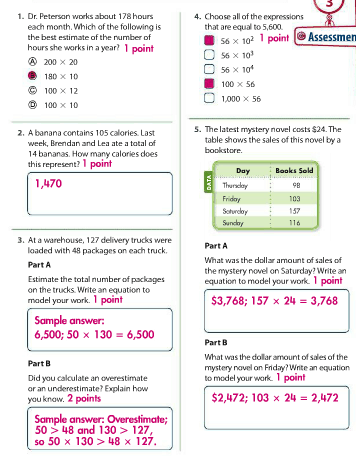 However, no problem on this page of this assessment actually assesses the fluency required by 5.NBT.B.5 Fluently multiply multi-digit whole numbers using the standard algorithm.