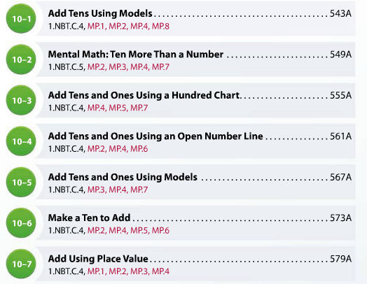 The grade 1 standard, 1.NBT.C.4 says: Add within 100, including adding a two-digit number and a one-digit number, and adding a two-digit number and a multiple of 10, using concrete models or drawings and strategies based on place value, properties of operations, and/or the relationship between addition and subtraction; relate the strategy to a written method and explain the reasoning used. Understand that in adding two-digit numbers, one adds tens and tens, ones and ones; and sometimes it is necessary to compose a ten. The last sentence highlights the conceptual understanding 1st graders need in order to generalize and add larger numbers over the next couple of years. However, this list of lessons looks like a checklist of possible models and strategies without an acknowledgment of the mathematical concept underlying this standard.